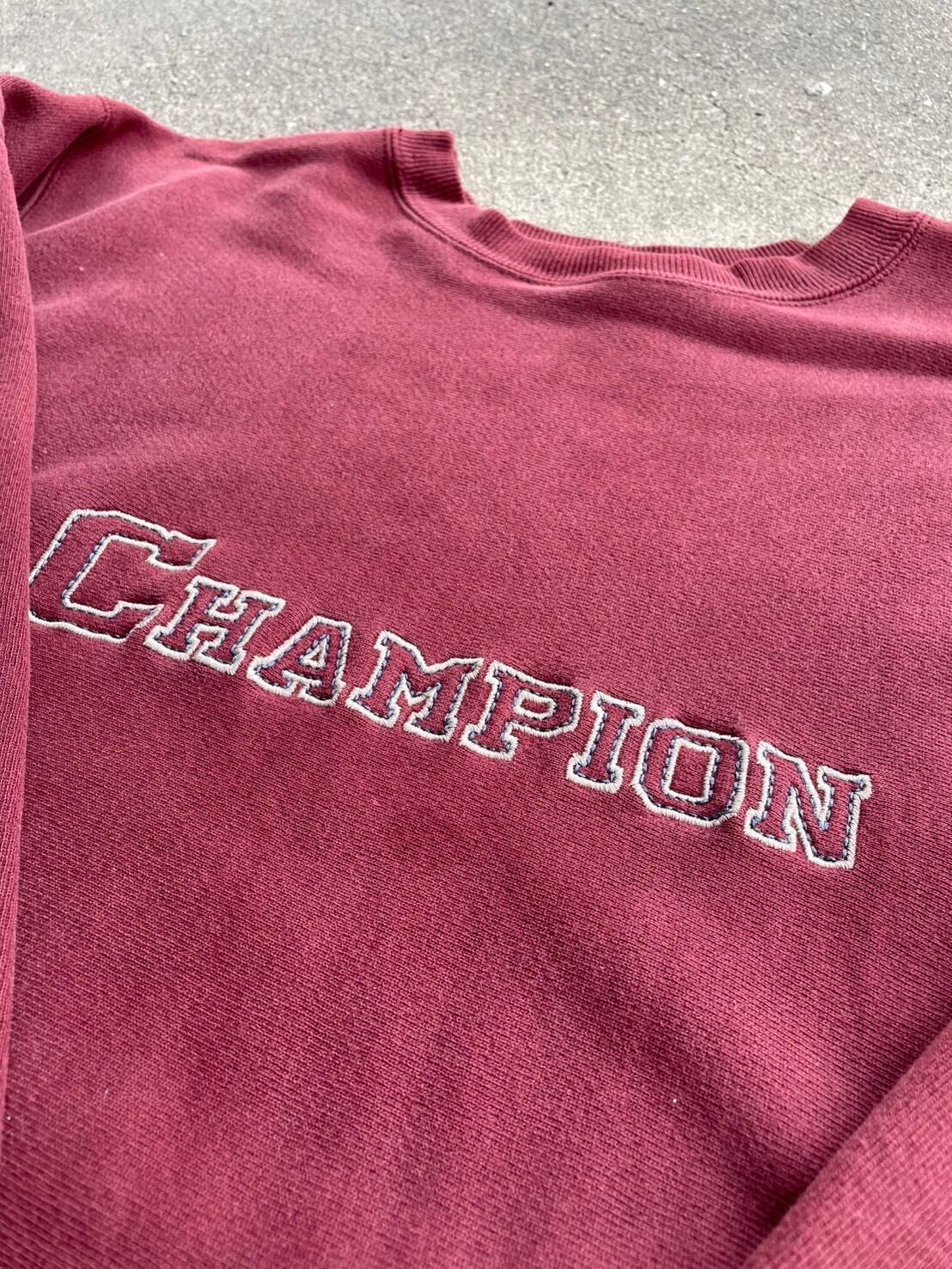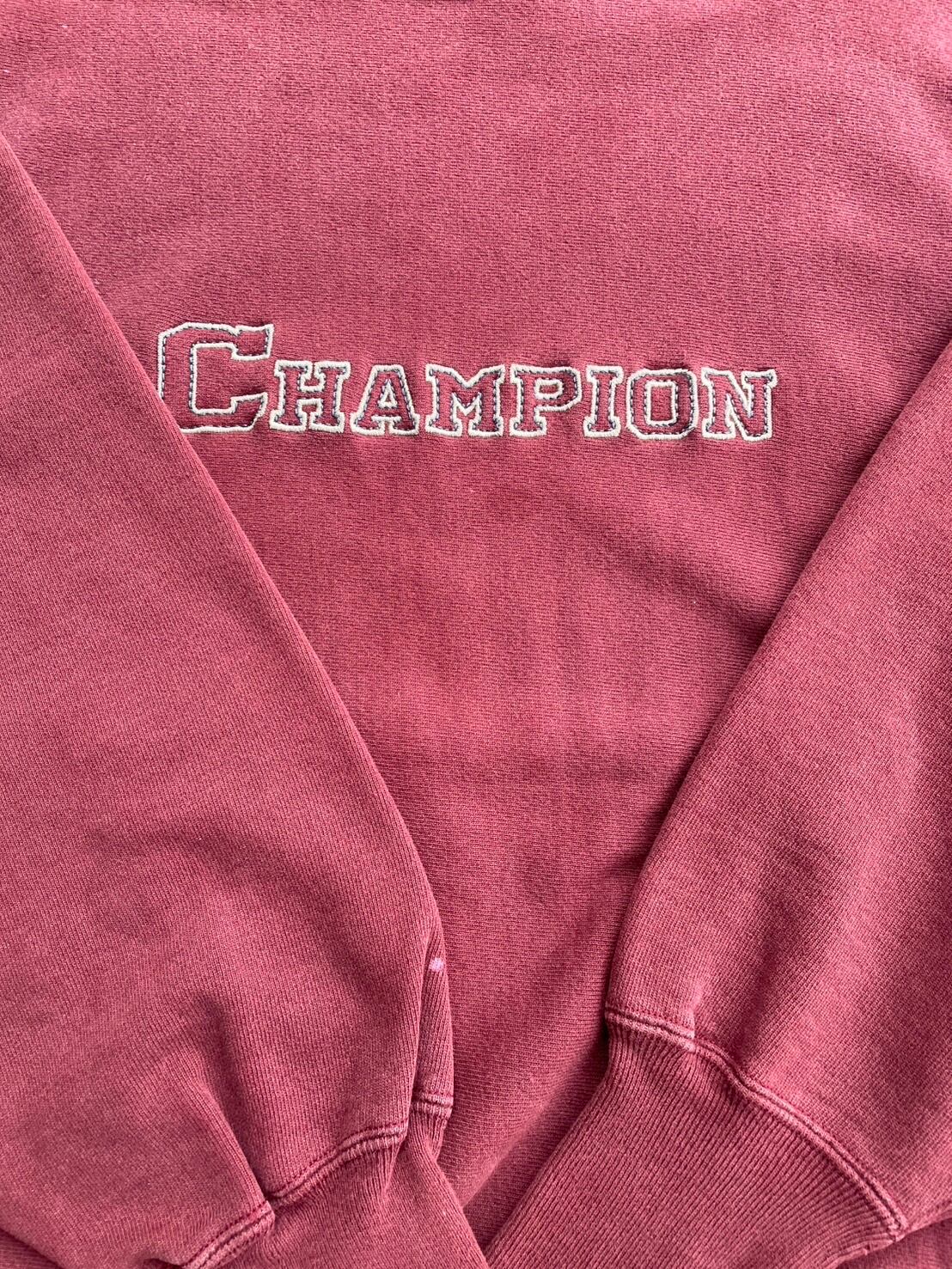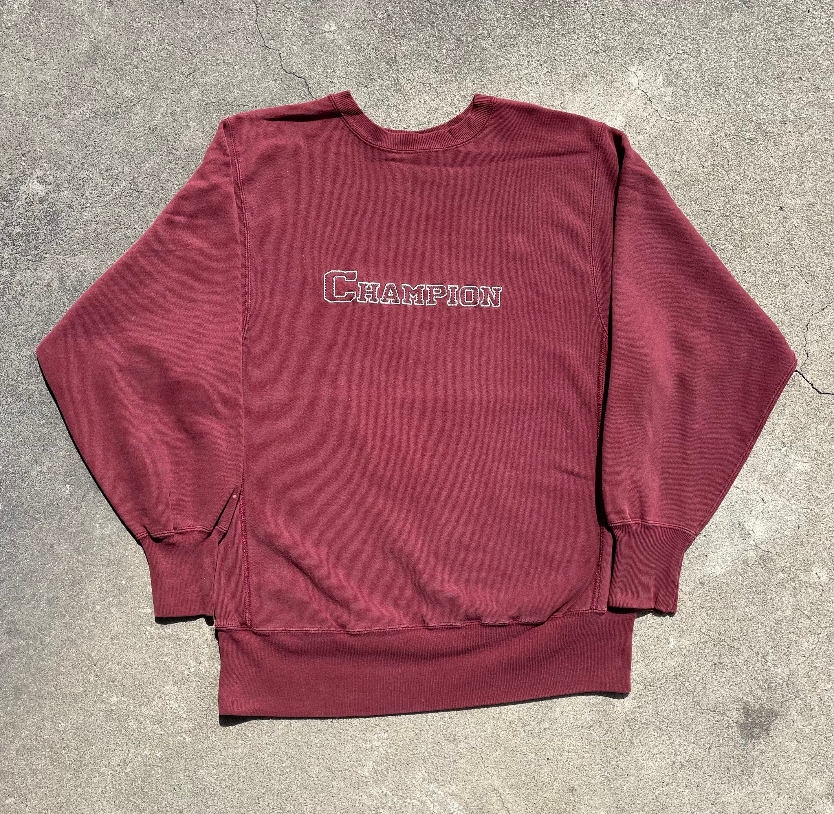 ・深みのあるバーガンディカラーに、クラシックなカレッジフォントの刺繍ロゴが映える、非常に雰囲気のある一着