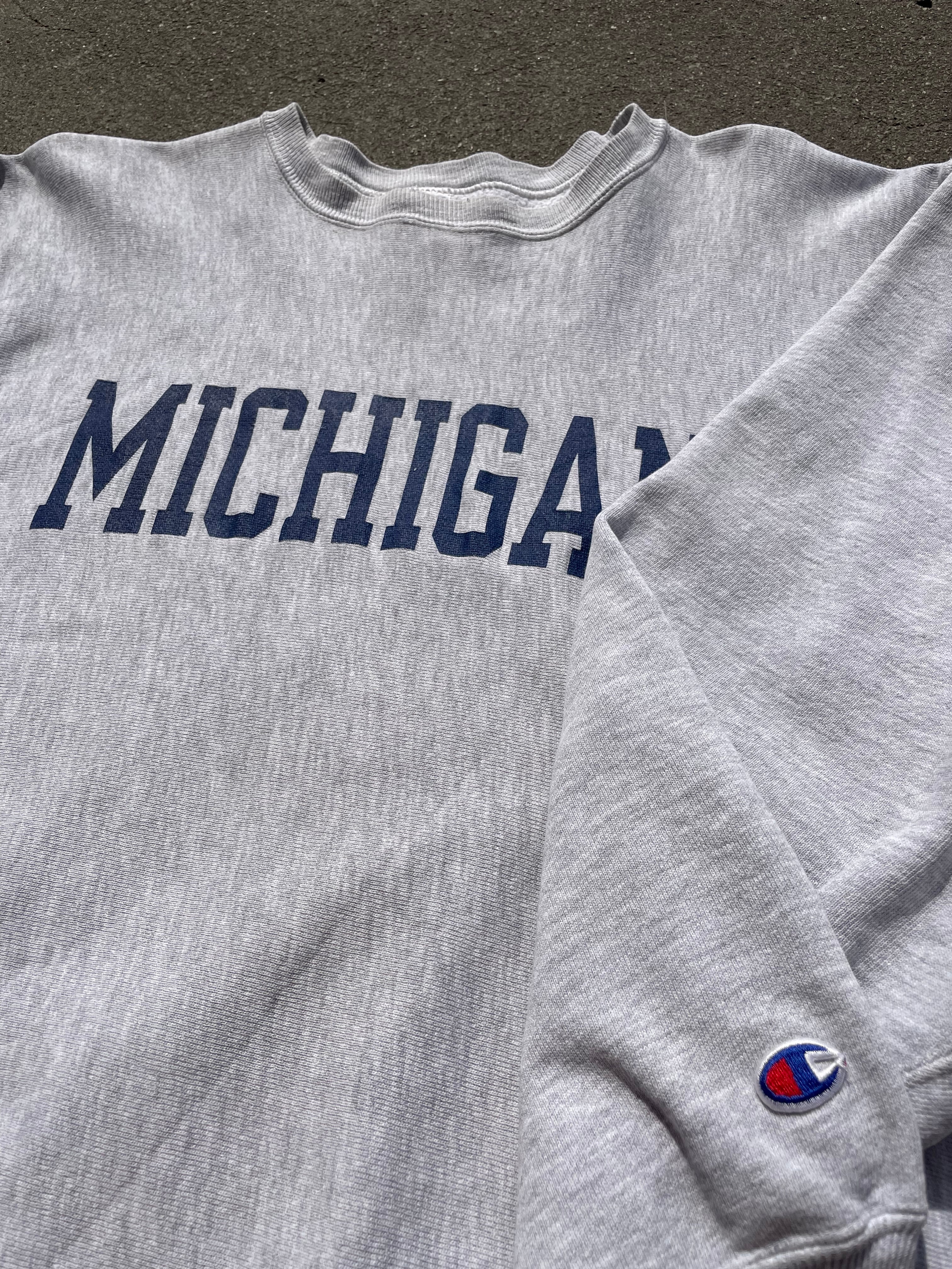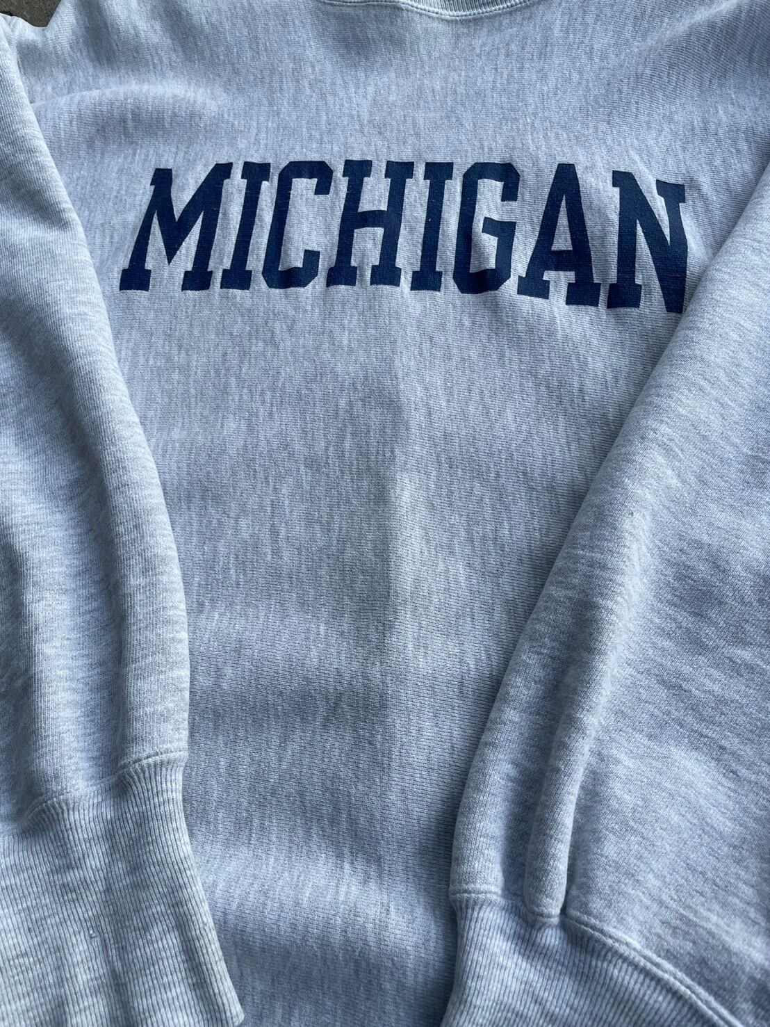・90年代Champion(チャンピオン)製のリバースウィーブスウェット。アメリカ製で、今では希少価値の高いヴィンテージアイテムです。フロントには人気のカレッジロゴ「MICHIGAN」がネイビーカラーでプリントされており、霜降りグレーのボディとの相性も抜群です。