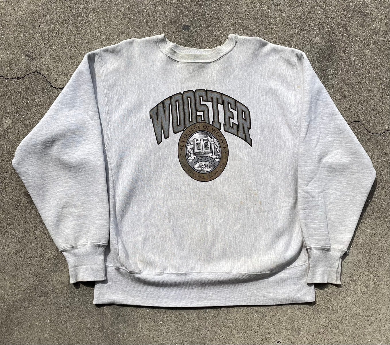 ・フロント中央に大きく「WOOSTER(ウースター大学)」のアーチロゴ、その下には大学のエンブレムがプリントされ、クラシックで重厚感のあるデザインが魅力。アメカジ・カレッジスタイルにぴったりの一枚です