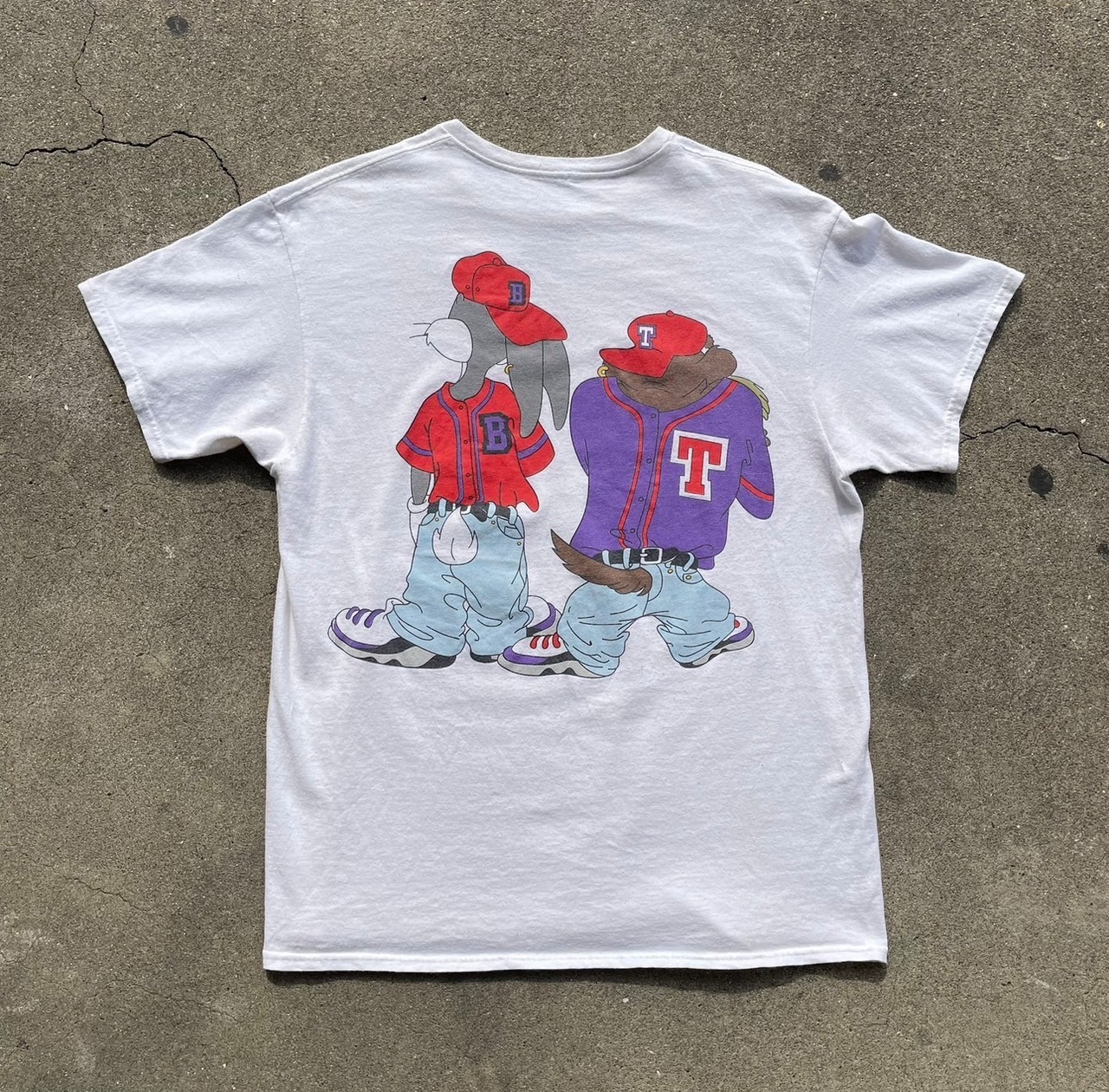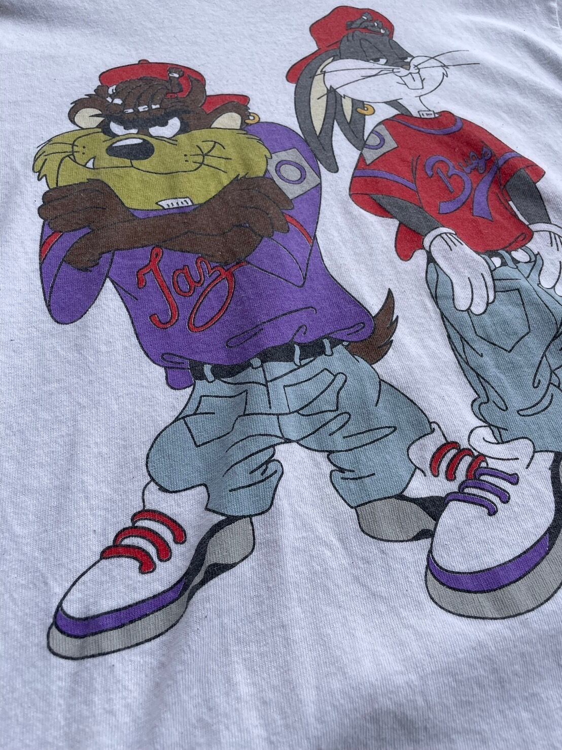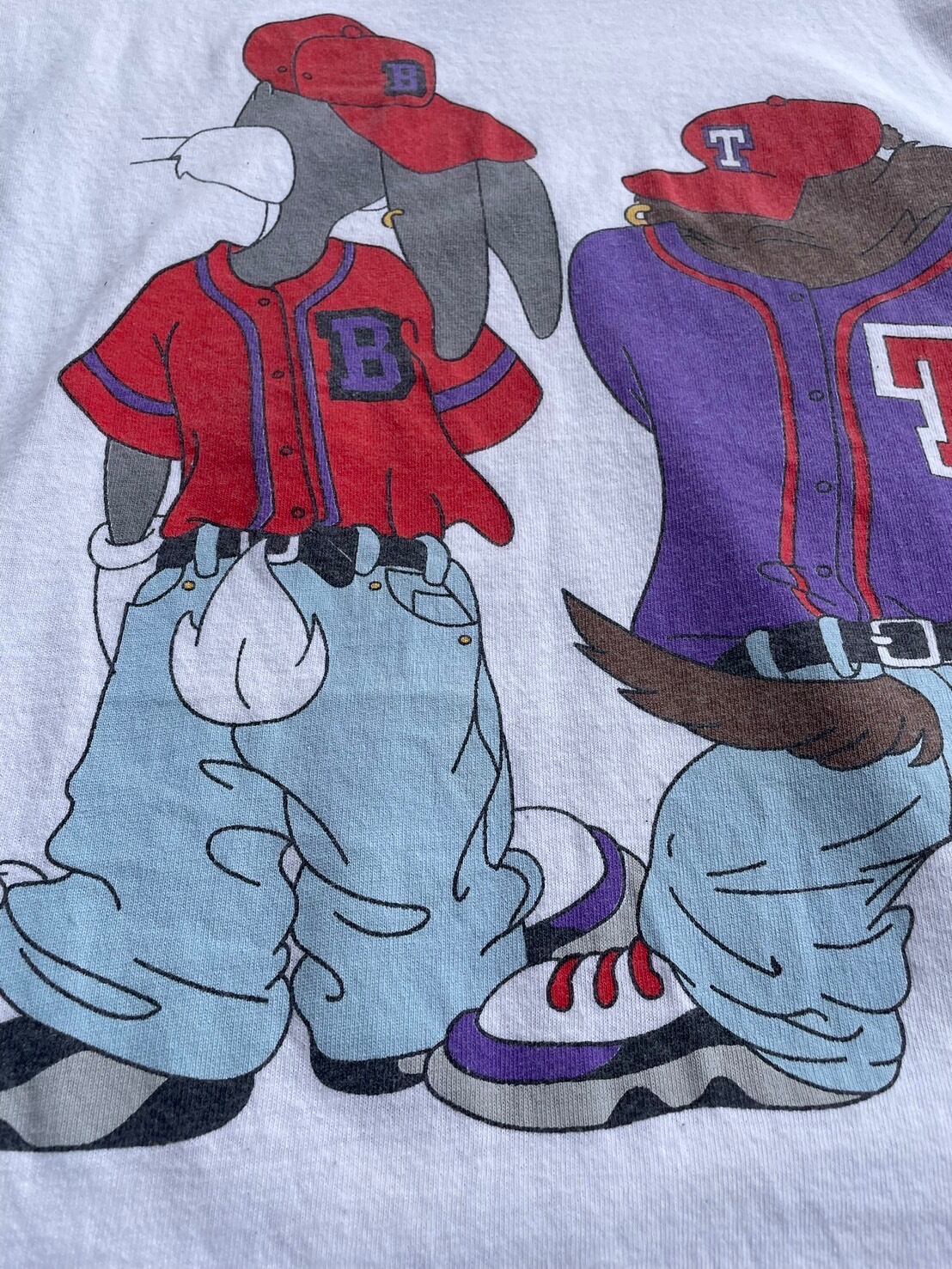 フロントには、ヒップホップスタイルに身を包んだバッグスとタズが肩を並べて立つデザイン。キャップにオーバーサイズのストリート系ウェア、スニーカーまで細部にこだわった90年代感漂うグラフィックが魅力です